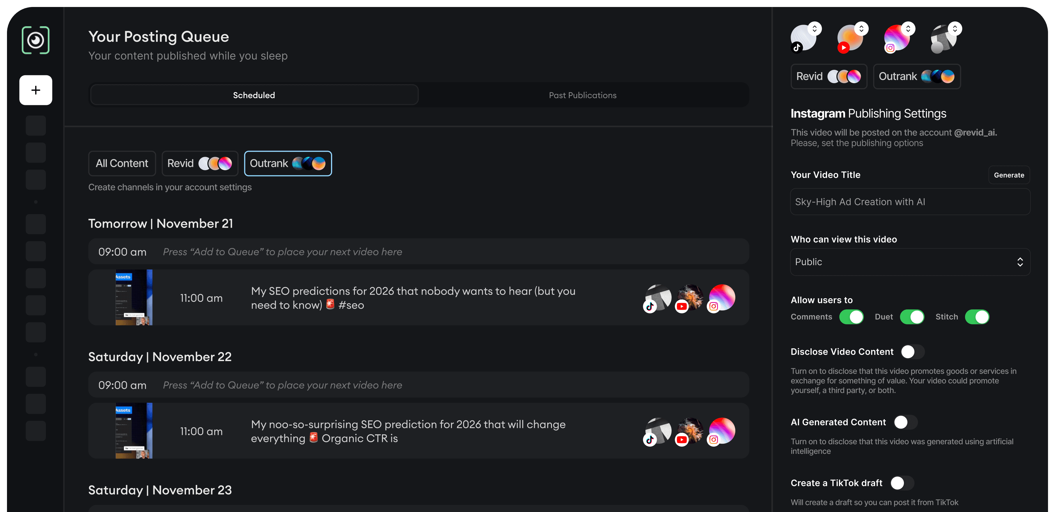 Stop switching between apps. Create your video once, then schedule and auto-publish to YouTube, TikTok, and Instagram - all from Revid's unified dashboard.